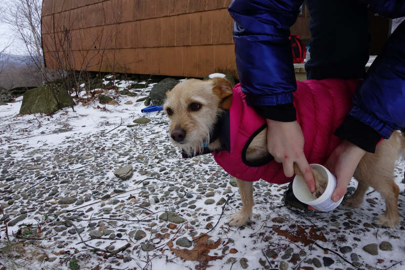 Description: Bonnie's toe-beans must be protected. She awaits patiently to run in the snow like a husky
