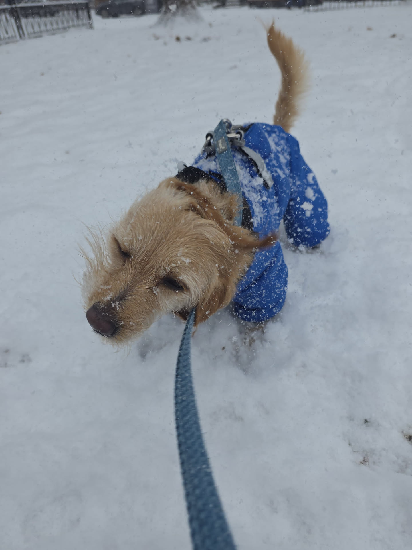 Description: Bonnie removes the snow from her coat the only way she knows how