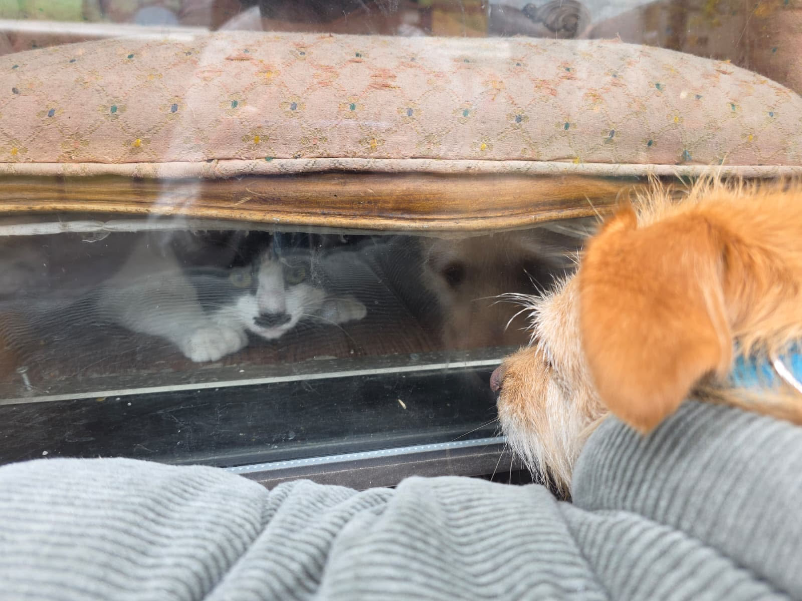 Description: Bonnie has spotted her nemesis, a cat. Thankfully, it is behind a protective layer of glass. Otherwise, Bonnie would attacc
