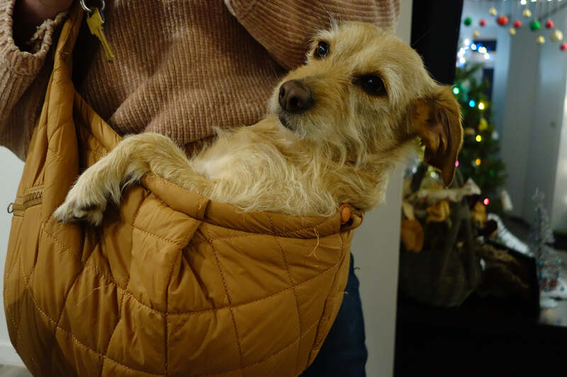 Description: Bonnie reaches peak comfort pressed up against her human in a little kangaroo purse
