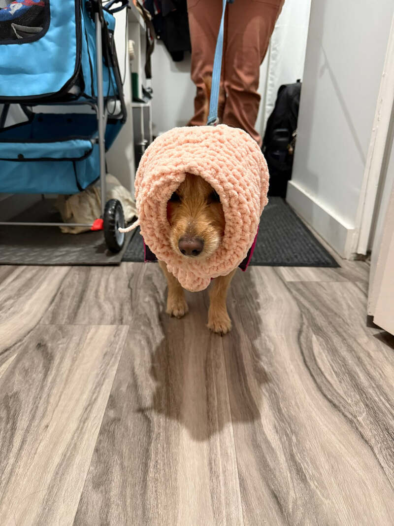 Description: In extreme cold, Bonnie wears her fashionable and soft pink cowl