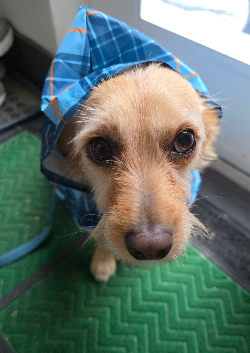 Description: Bonnie looks adorable in her raincoat, even though getting her dressed takes longer than the amount of time she spends outside when it is raining because she hates the rain so much